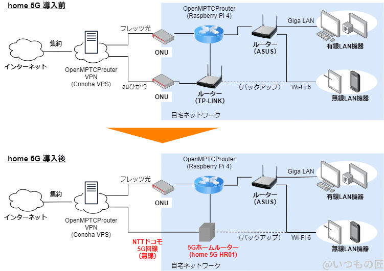 NTTドコモの5G通信回線が安定していれば、home 5Gでメイン回線の置き換えが可能です。例えば、筆者の自宅では下記の構成が考えられます。