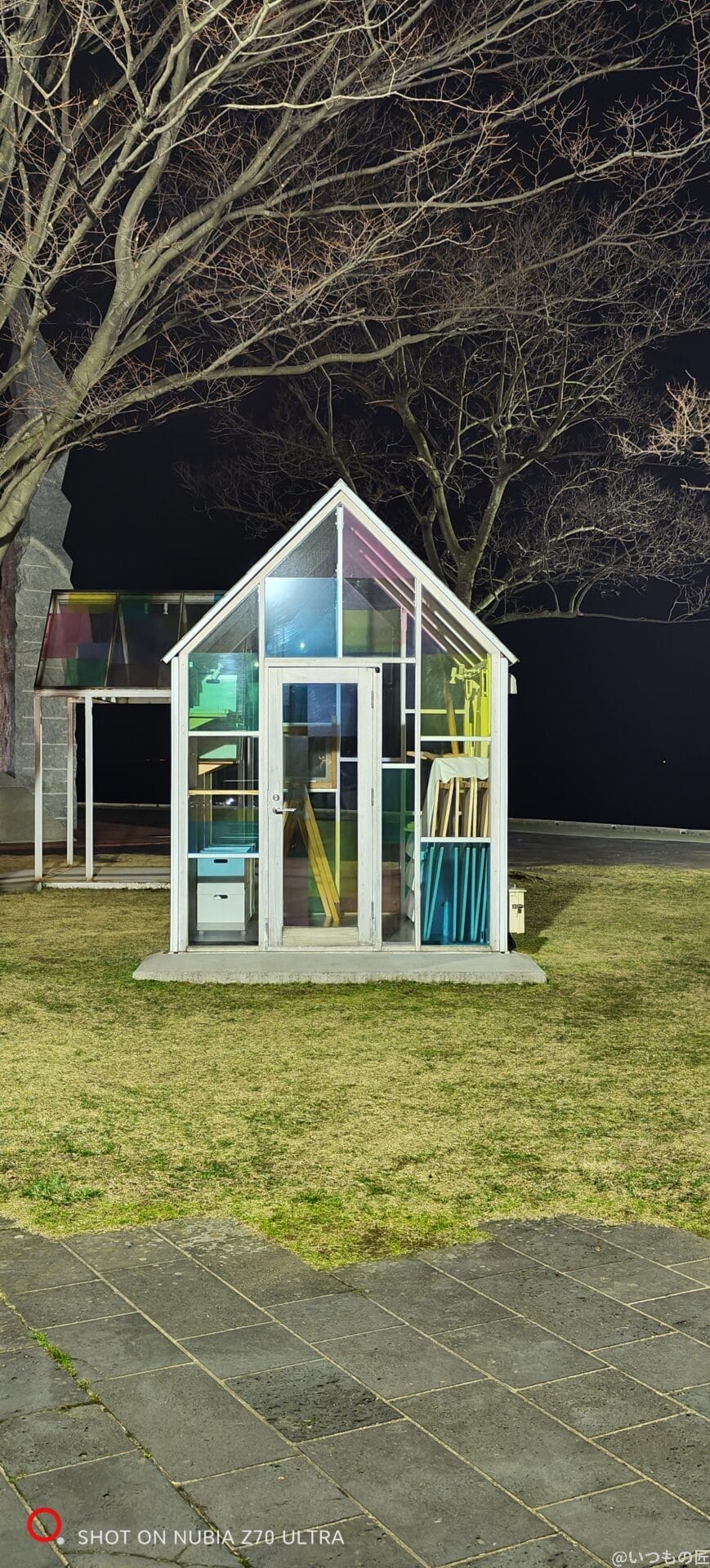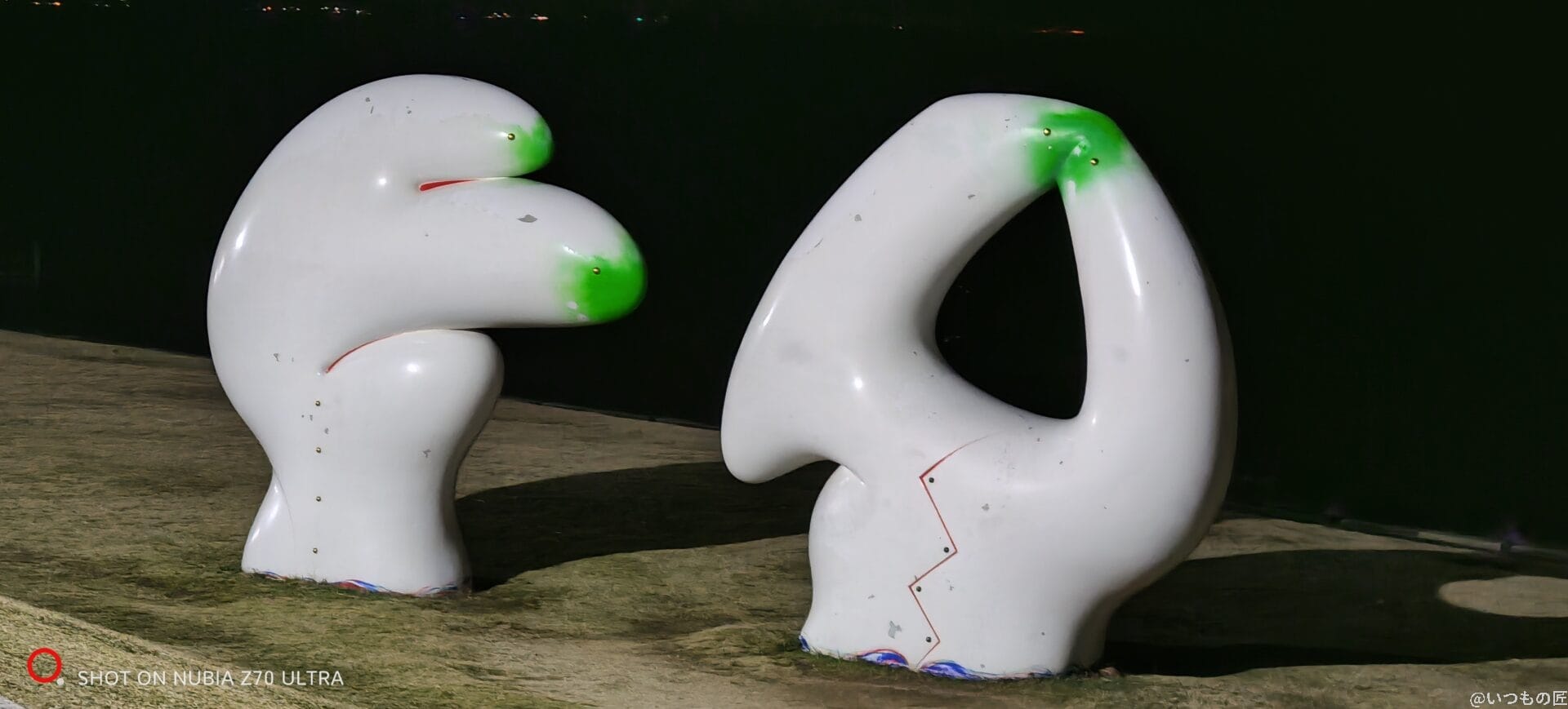 以下は、ナイトモードで暗所撮影した写真です。通常モードでは色のにじみや立体感の乏しさが目立っていたオブジェの輪郭や土台の模様が、ナイトモードではくっきりと描写されました。