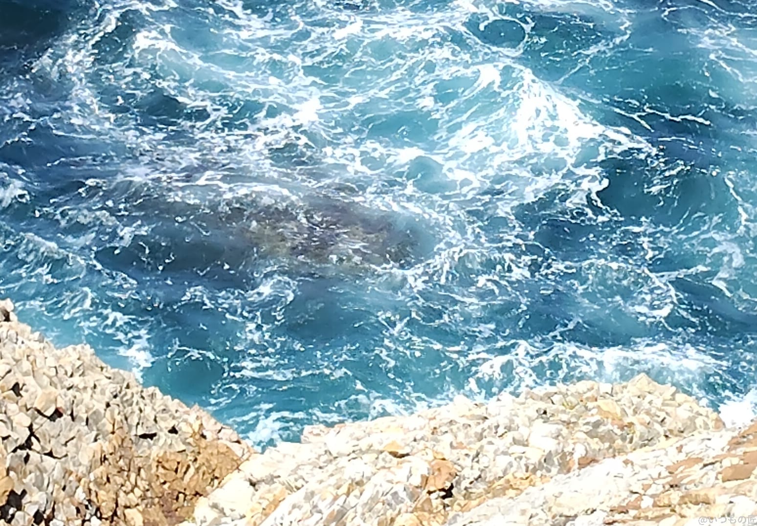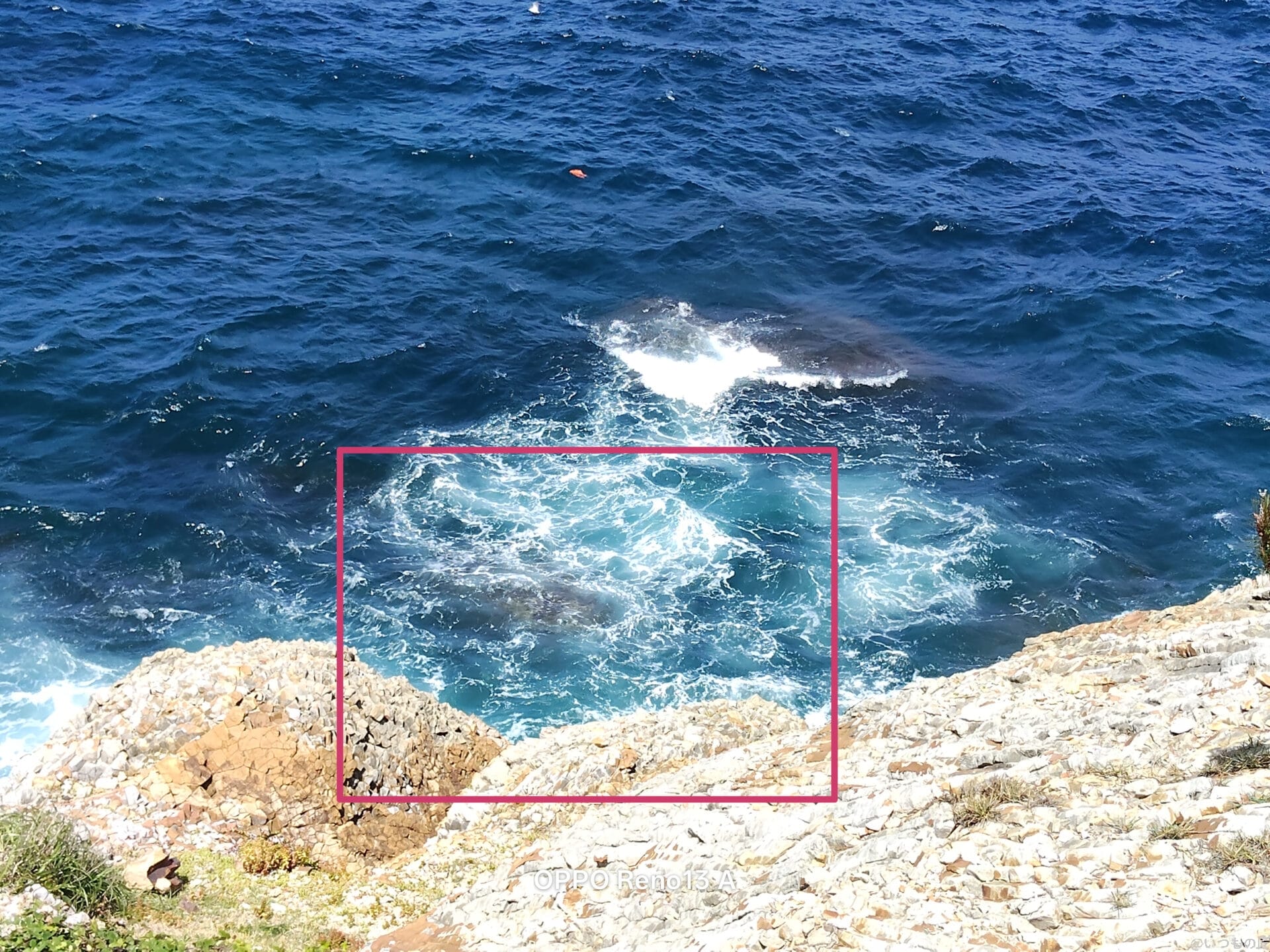 以下は、海の水しぶきを捉えた写真です。日光の影響で岸壁部分がやや白っぽくなりましたが、海の青さがしっかりと表現されており、自然でダイナミックな風景写真に仕上がりました。